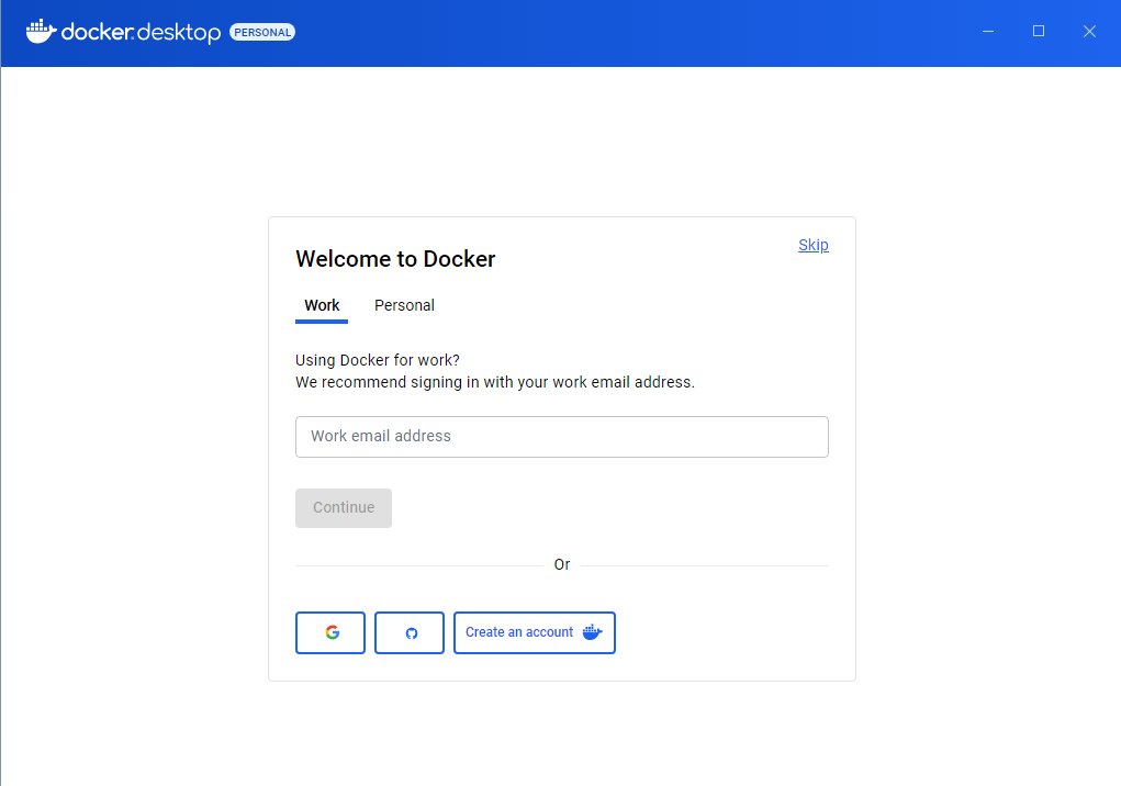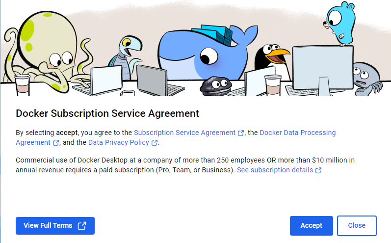 After installing Docker Desktop, launch the application to be presented with the “First Run” dialog. Click Accept on the terms of service. Docker Desktop is free to use for educational purposes. You can click skip on the account creation page.