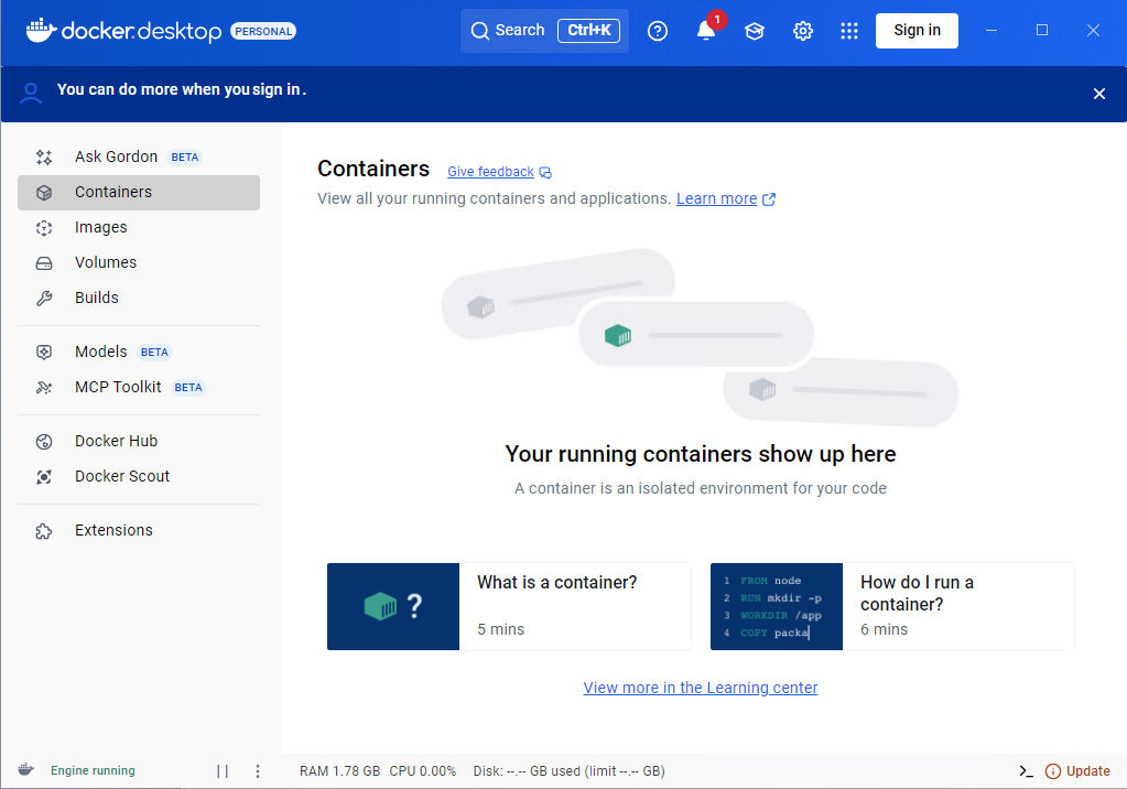 After a successful install, the Docker Desktop homepage will look like this: