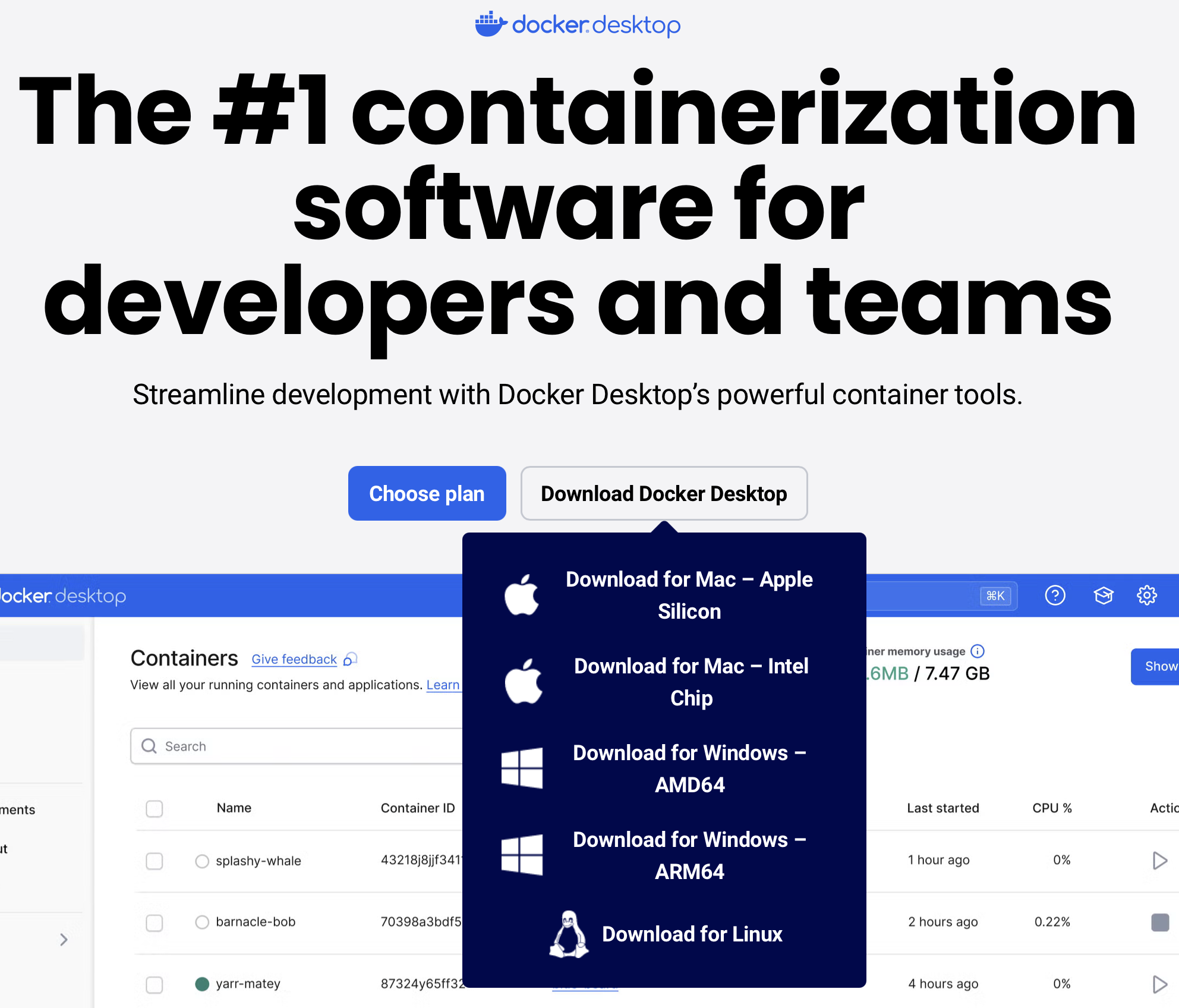You can download the Docker Desktop installer for your operating system from: https://www.docker.com. Click the “Download Docker Desktop” button.