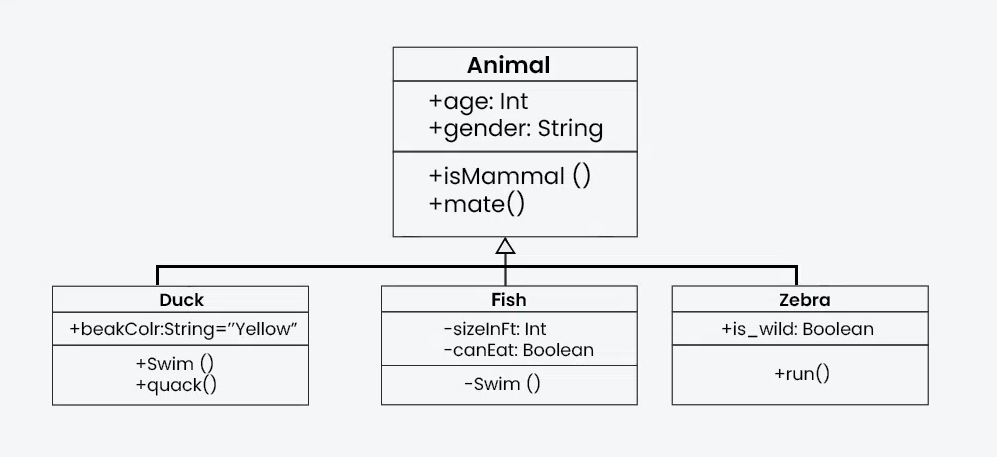 Here’s an example of a UML class diagram featuring multiple classes with an “inheritance” relationship: