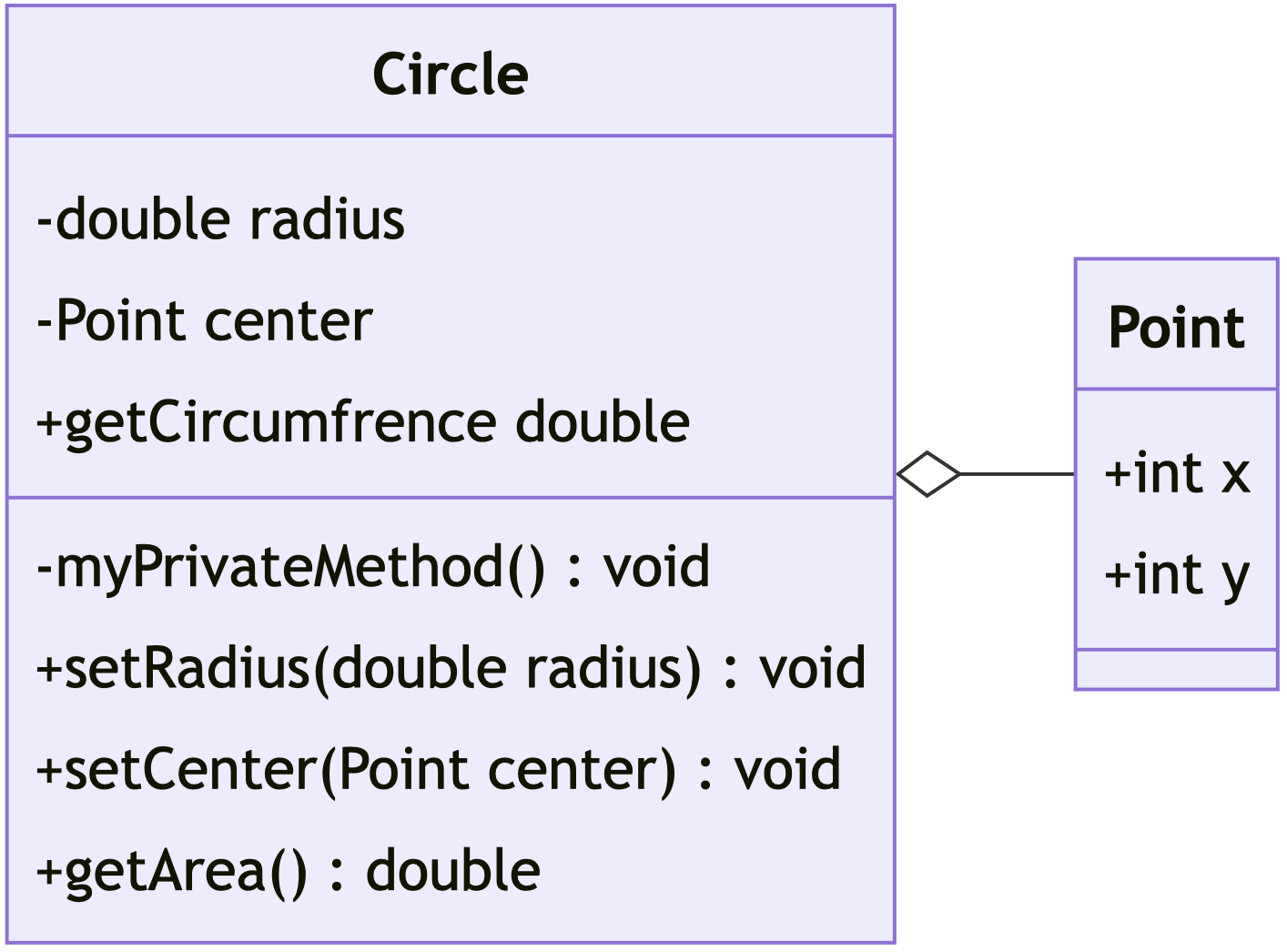 Even without code, with the UML diagram we can effectively communicate that the Point class has two member variables: x and y. The solid line with a white diamond connecting the two classes signifies an aggregation relationship between them, indicating that the Point class is a part of the Circle class, but can exist independently of the Circle class.
